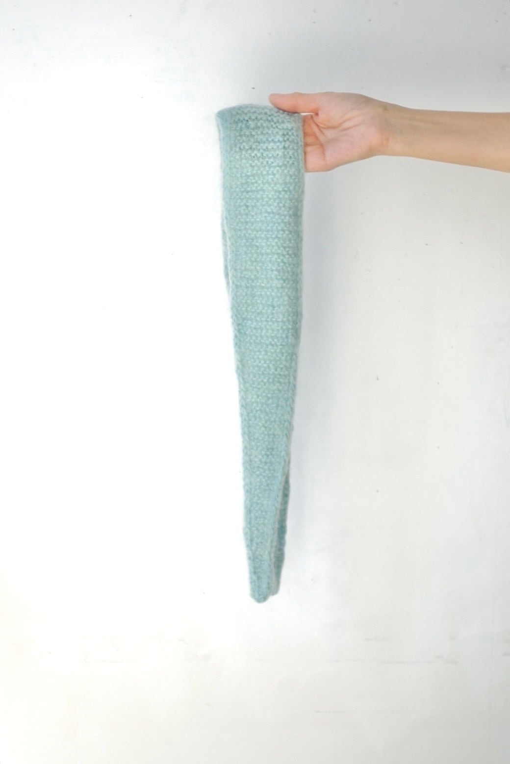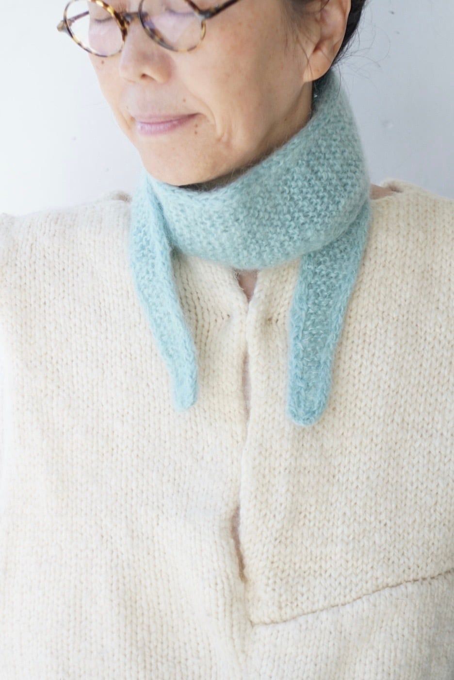 小さなマフラーは柔らかなモヘヤの毛糸で編みました。