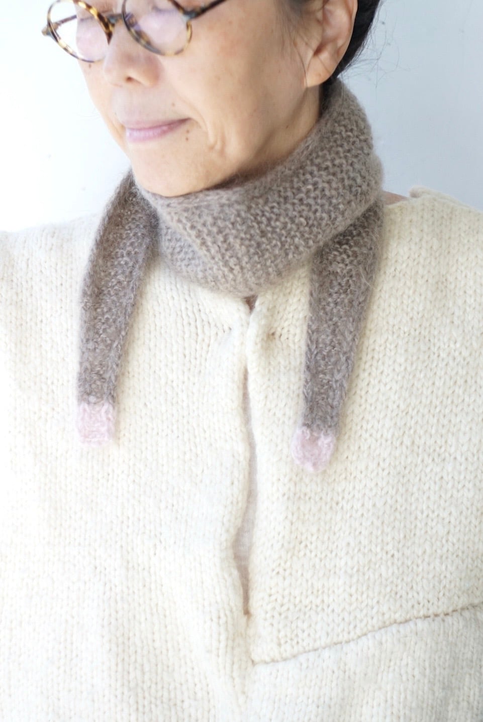 小さなマフラーは柔らかなモヘヤの毛糸で編みました。